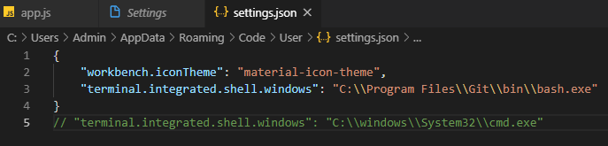 그리고 이 프로젝트의 버전관리는 git을 사용하기 위해 터미널을 git bash로 바꿔줘야합니다.