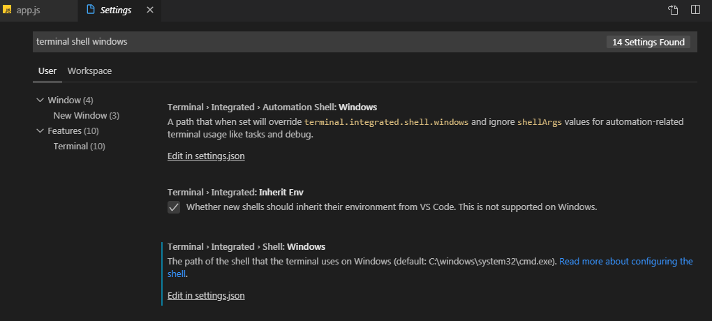 Shell: Windows에 Edit in settings.json을 클릭하면 터미널 설정 json 파일을 수정할 수 있습니다.